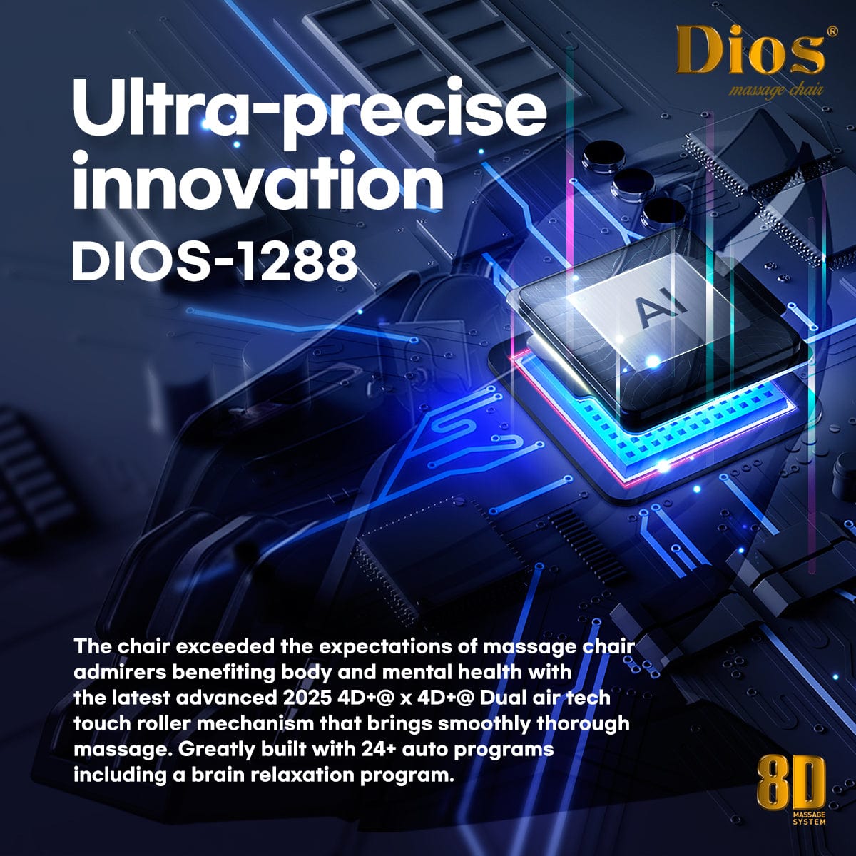 The Dios 1288 massage chair revolutionizes relaxation with its innovative 8D AI Dual Air Tech Touch Roller system, representing the latest advancement in 2025 massage technology.