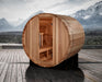 The thoughtfully designed interior comfortably accommodates two adults, creating the perfect environment for shared relaxation or peaceful solitude. The cozy dimensions (78"H × 75"W × 59"L) provide ample space while maintaining the efficiency advantages of the classic barrel design.